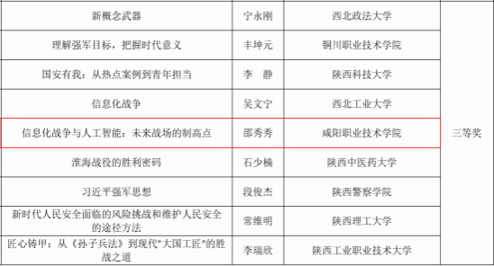 近日,陕西省教育厅办公室公布了2025年学校国防教育展示活动获奖名单。我院辅导员邵秀秀在学校军事课教学展示活动(高校组)中荣获三等奖。