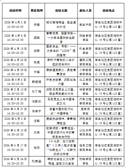 请相关二级学院优先选派学生干部、团员参加,每场活动参加学生人数为24人,学生需携带本子和笔,提前10分钟到场(如遇节假日或其他特殊情况,活动时间调整,届时会提前通知各二级学院)。