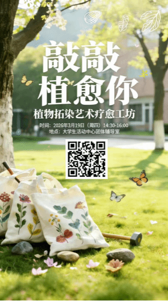 为帮助大家更好地适应校园生活,释放压力、探索自我,学生心理健康发展研究中心将于本学期推出一系列主题团体心理辅导活动。作为系列活动的第一场,我们邀请您走进《敲敲“植”愈你》植物拓染艺术疗愈工坊——用最温柔的方式,把春天敲进心里。